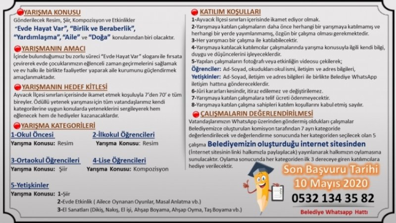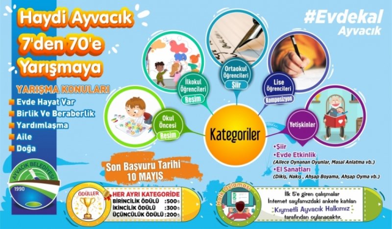 Ayvacık Belediyesi olarak Covid-19 salgını sebebi ile İçinde bulunduğumuz bu zorlu süreci “Evde Hayat Var” sloganı ile fırsata çevirerek evde çocuklarımızın eğlenceli zaman geçirmelerini sağlamak ve ev halkı ile birlikte faaliyetler yaparak aile kurumunu güçlendirmek amacıyla 7’den 70’e tüm vatandaşlarımız için ödüllü yetenek yarışması düzenledik...