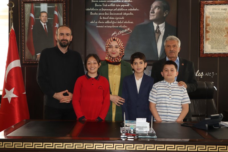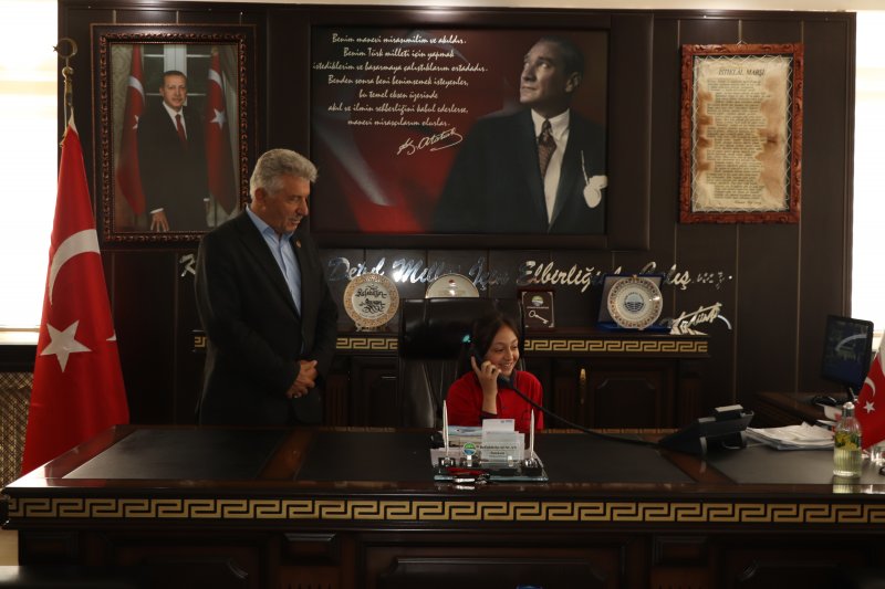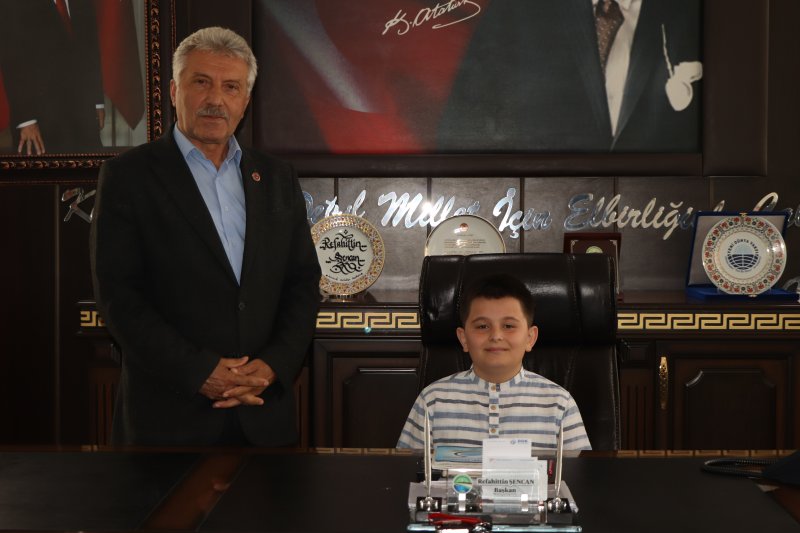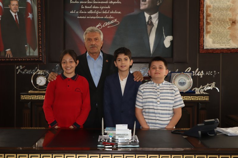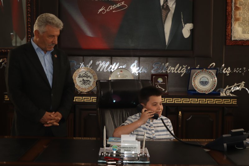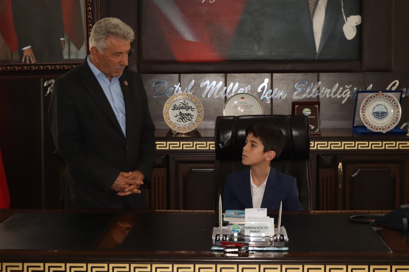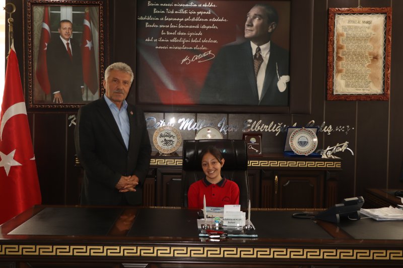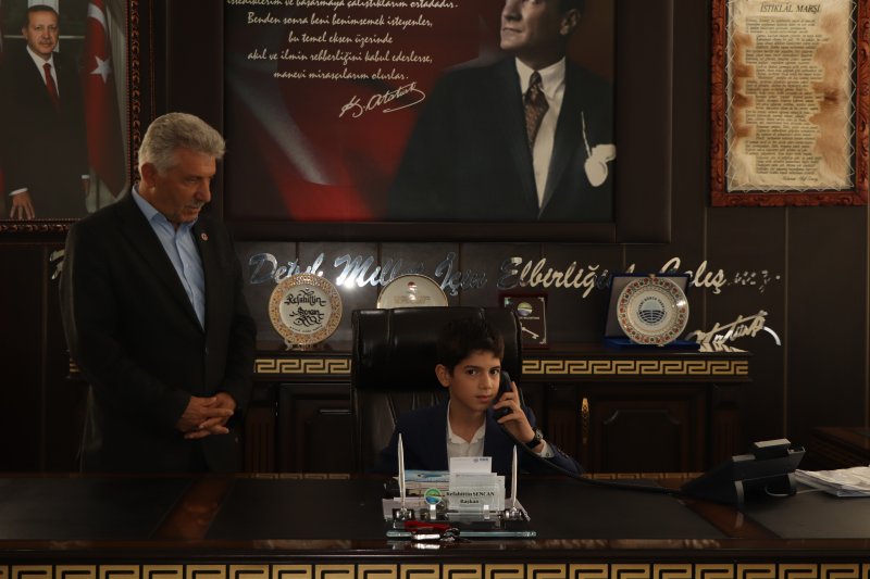 5/B sınıfı öğrencileri İlker Türe ve Ayşe Minel Bayram ile 5/A sınıfı öğrencisi Ömer Asaf Aydın, Belediye Başkanımızın makam koltuğunu temsili olarak devralarak, bu anlamlı günde çocukların sesine kulak verdi.
